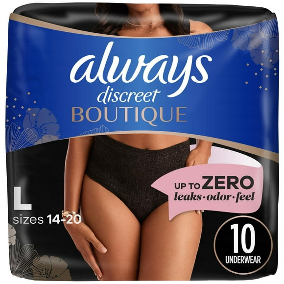 Always Discreet Boutique Incontinence and Postpartum Underwear for Women, Maximum Protection, L, Black, 10CT