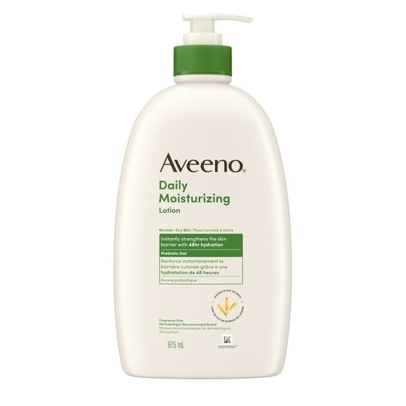 Aveeno Daily Moisturizing Body Lotion with Soothing Prebiotic Oat, Gentle Lotion Nourishes Dry Skin With Moisture, Paraben-, Dye- & Fragrance-Free, Non-Greasy & Non-Comedogenic, 975 ml, 975 mL