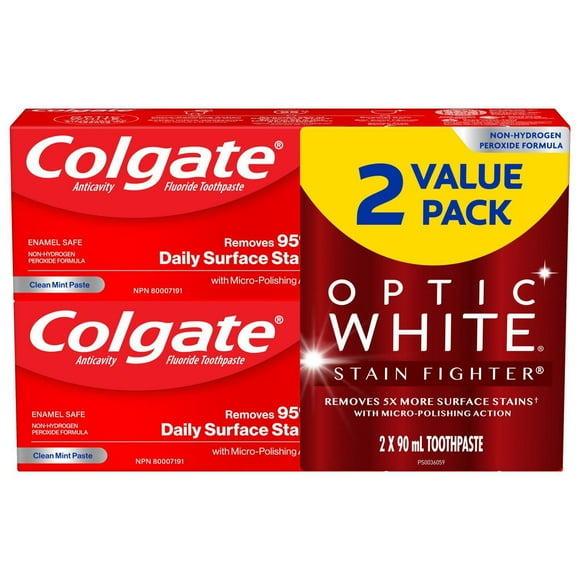 Colgate Optic White Stain Fighter Stain Removal Toothpaste, Clean Mint Paste, 90 mL, 2 Pack