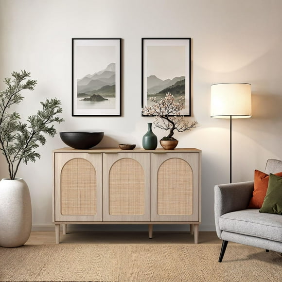 CorLiving Freya Engineered Wood Sideboard with 3 Arched Rattan Doors and 4 Shelves, Light Brown
