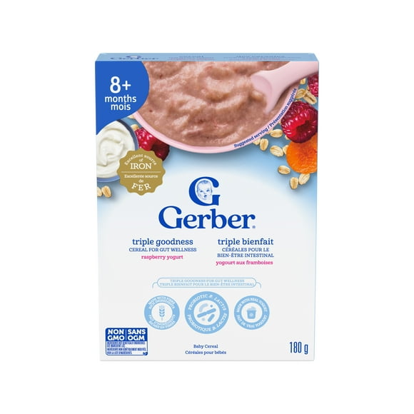 Gerber Triple Goodness Raspberry Yogurt Baby Cereal, 8 Months+, Promotes Gut Wellness, Fibre-rich Ingredients, Probiotic B. lactis, Real Yogurt, Fruits & Veggies, Source of B Vitamins, 180 g