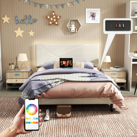 Homy Casa Upholstered Queen Bed with LED Light Strip and Charging Ports for Kids or Teens Room, Beige