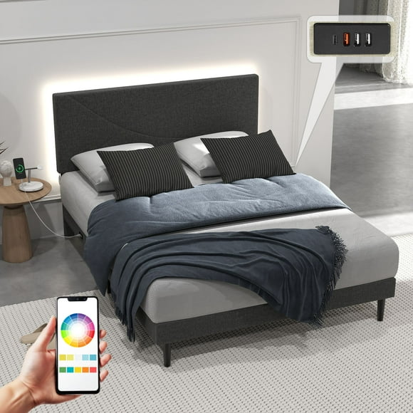 Homy Casa Upholstered Queen Bed with Tech Charging and LED Lights, Modern Headboard, Grey