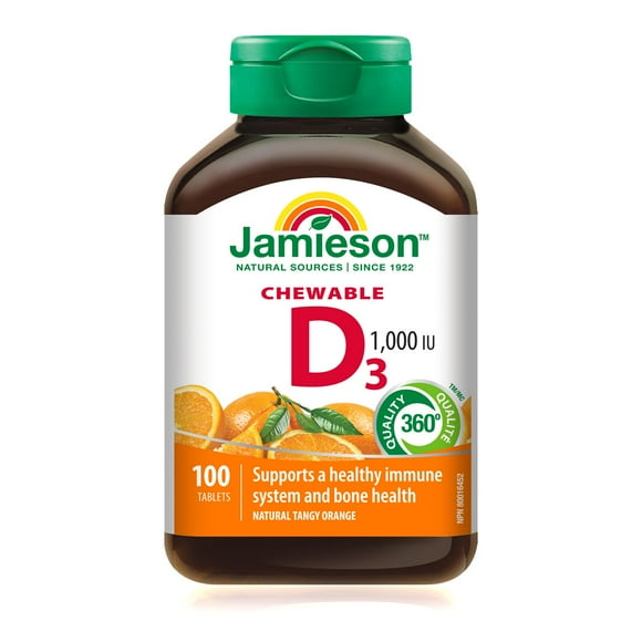 Jamieson Chewable Vitamin D3 1,000 IU Natural Tangy Orange Flavour, 100 chewable tablets