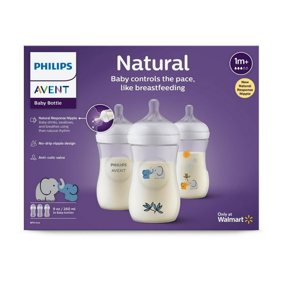 Philips Avent Natural Baby Bottle With Natural Response Nipple, With Blue Elephant Design, 9oz, 3 pack, SCY903/63, Avent Deco Bottle 9oz 3pk
